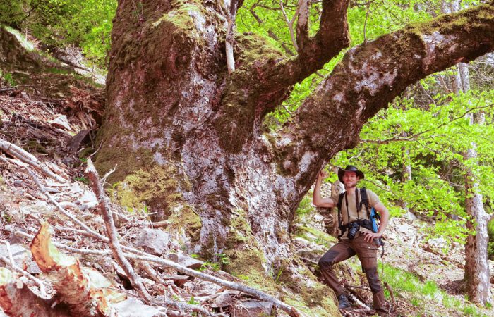 In der Art eines erfahrenen Scouts führte Michel Grün das Deutsche Baumarchiv zu diesem wahrhaft phänomenalen Schwarzwald-Ahorn. Er steht spektakulär am Steilhang, an einem gut versteckten Standort in der Hochlage des Gebirges. In der Nähe rutscht ein unruhiges Meer aus Felsbrocken und Geröll langsam hangabwärts – schwieriges, instabiles Gelände für den Menschen und sein Schuhwerk! Der Baum dagegen hat sich erfolgreich im Boden verankert, nur der stete Kampf mit den Elementen ist ihm anzusehen. Im Foto ist Michel Grün neben seinem weiteren national bedeutsamen Fund zu sehen. Die nicht ganz leichte Messung des Bergahorns (1 m über dem Boden, nur unter einem  Starkast etwas niedriger, Maßband hangparallel geführt) ergab sage und schreibe: 6,43 m.