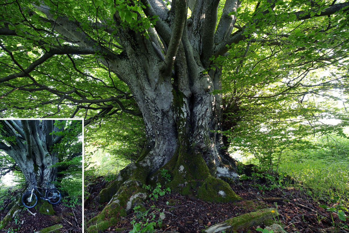 „Hutebuchen“ oder „Weidbuchen“ wachsen besonders oft in den Höhenlagen der süddeutschen Mittelgebirge, der Rhön oder auch im nordhessischen Bergland. Auf – bis in die heutige Zeit hinein – extensiv bewirtschafteten Weideflächen begegnen uns diese knorrigen Baumgestalten. Rund um Albstadt auf der Schwäbischen Alb, in über 900 m Höhe, haben etliche Weidbuchen überdauert. In dieser abgelegenen Region, wo für Kraftfahrzeuge die Fahrt zu Ende ist, wird das Fahrrad zum idealen Verkehrsmittel. Auf einer seiner zivilisationsfernen Radtouren war Uwe Kühn, Deutsches Baumarchiv (Süd), in Onstmettingen, einem Stadtteil von Albstadt, unterwegs. Hier der Bericht: „In älteren Karten ist bei Onstmettingen noch die so genannte Freuleinsbuche verzeichnet. Doch die gibt es schon seit Jahren nicht mehr. Dafür entdeckte ich diese unglaublich mächtige Buche unterhalb des Burgberges! Mit einem Stammumfang von 7,80 m rutscht dieser Baum in die Spitzengruppe vergleichbarer Hutebuchen. Der monumentale, für Weidbuchen typisch mehrkernige Stamm (Hutebuchentypus) bildet eine dichte Krone aus wild aufstrebenden Ästen und Zweigen. Die sonst oft so glatte silbergraue Borke ist besonders im unteren Stammbereich schroff und rissig. Die Rückseite des Stammes ist offener und von jungen Wasserreisern geprägt. Dadurch gestaltete sich die Vermessung des kolossalen Stammes nicht ganz einfach.“