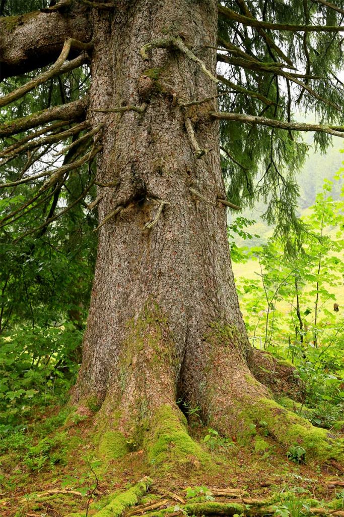 Zwei dicke Wetterfichten stehen am Berghang nahe Kapelle Wiesach, Stammumfang 5,18 und 5,48 m. Nationaler Baum-Entdecker: Uwe Kühn, Deutsches Baumarchiv.